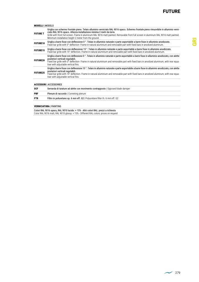 fisse con deflessione 0 °. Telaio in alluminio naturale e parte asportabile a barre fisse in alluminio anodizzato.