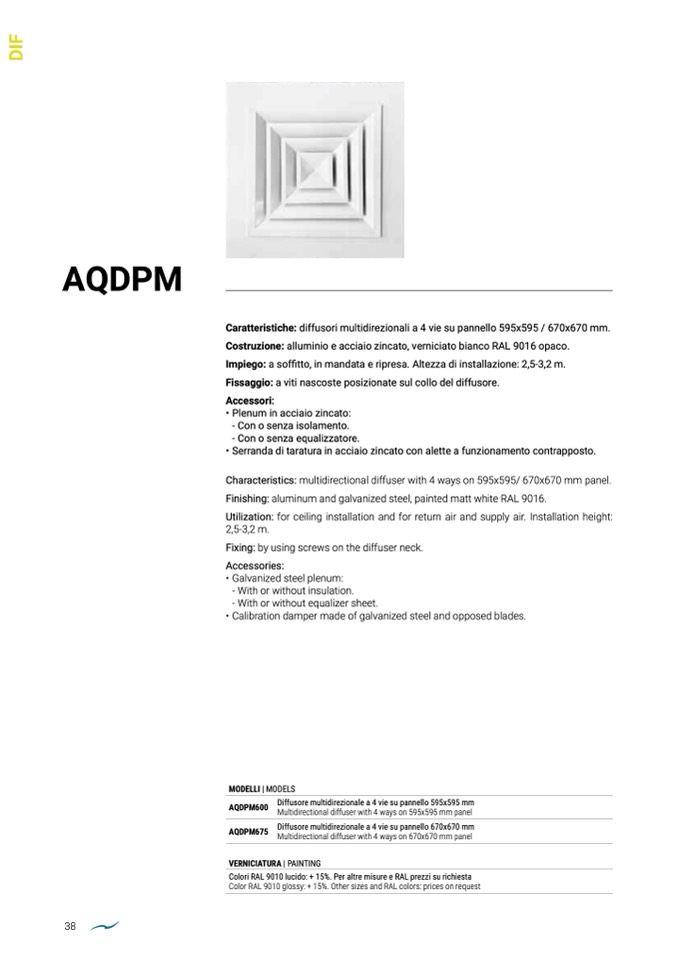 Impiego: a soffitto, in mandata e ripresa. Altezza di installazione: 2,5-3,2 m.