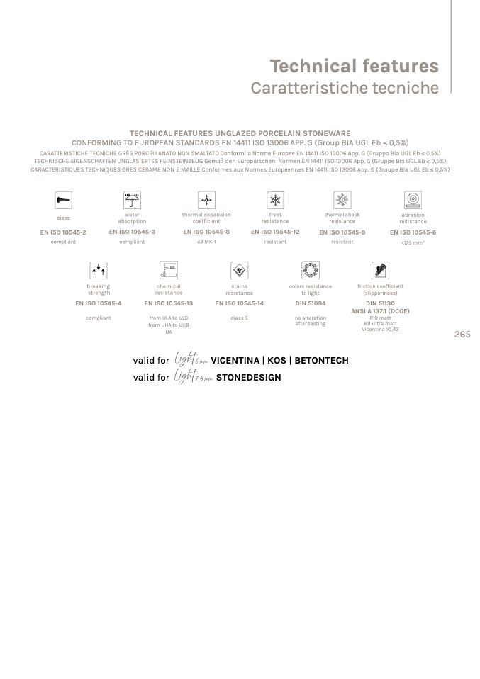 CARATTERISTICHE TECNICHE GRÈS PORCELLANATO NON SMALTATO Conformi a Norme Europee EN 14411 ISO 13006 App. G (Gruppo BIa UGL Eb ≤ 0,5%)