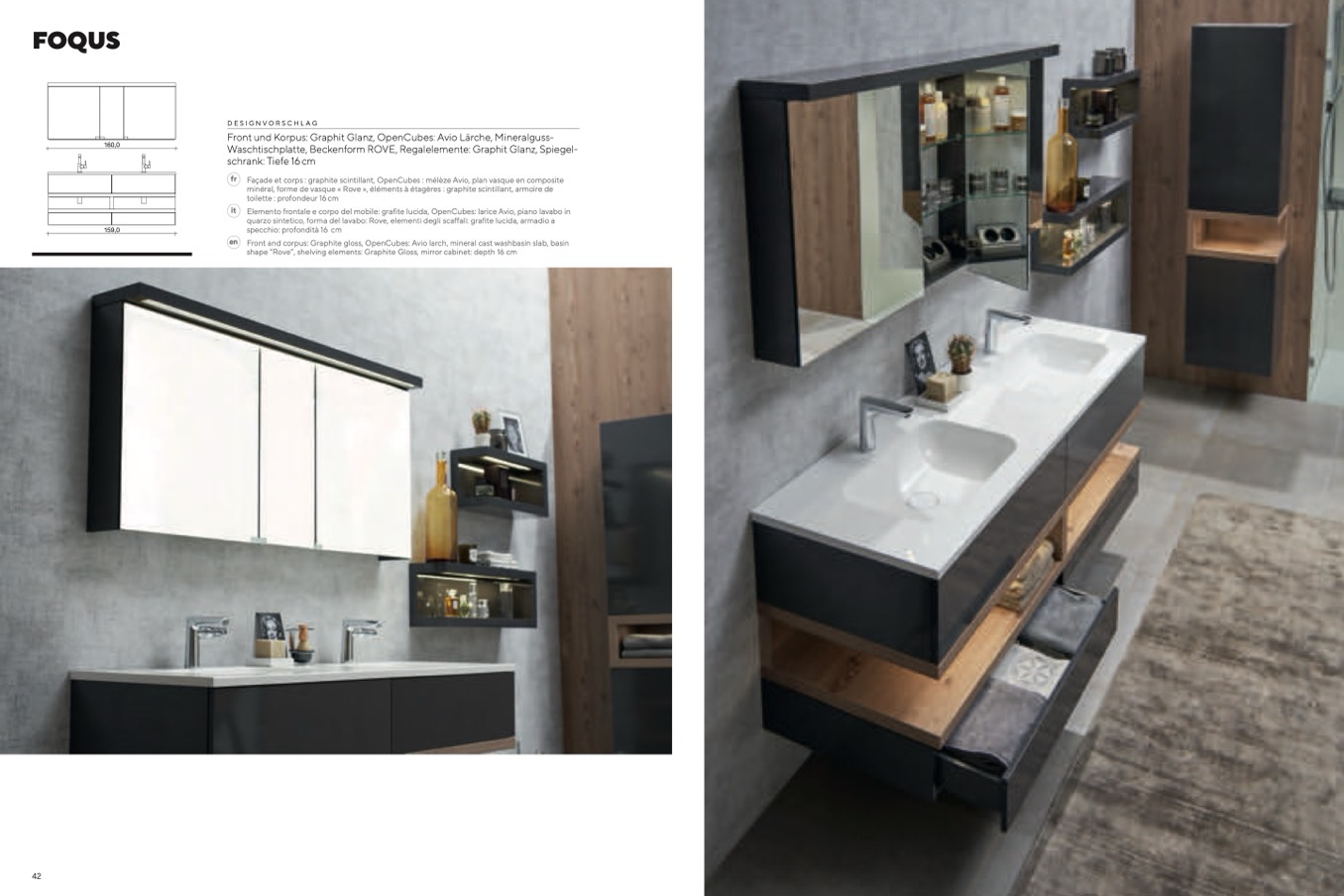 Front and corpus: Graphite gloss, OpenCubes: Avio larch, mineral cast washbasin slab, basin