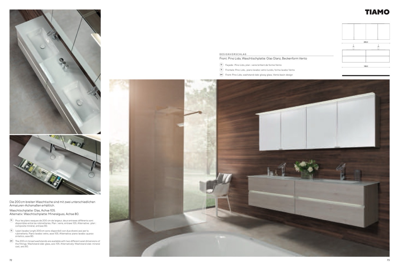 Frontale: Pino Lido, piano lavabo: vetro lucido, forma lavabo Vento