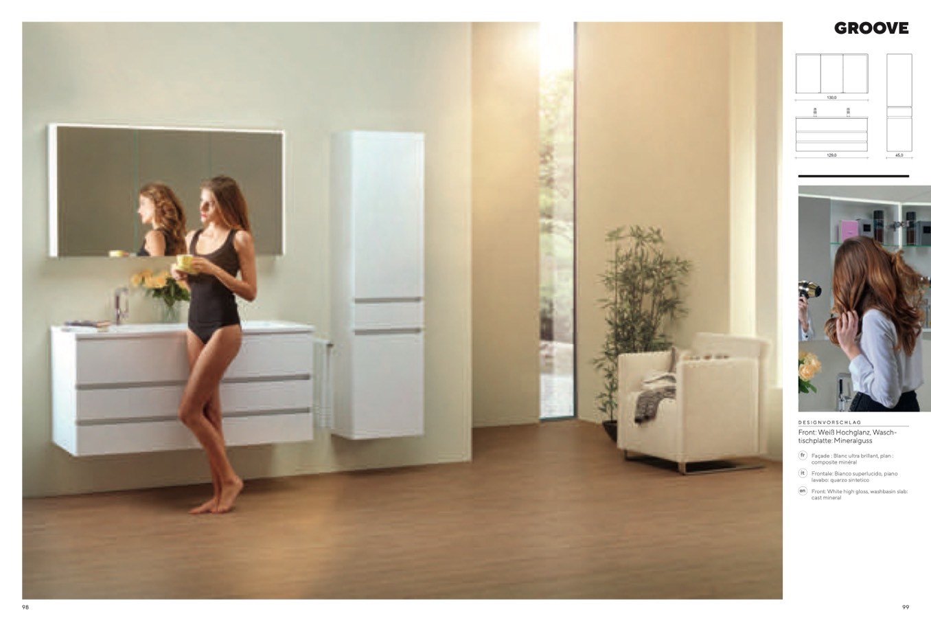 Front: White high gloss, washbasin slab: