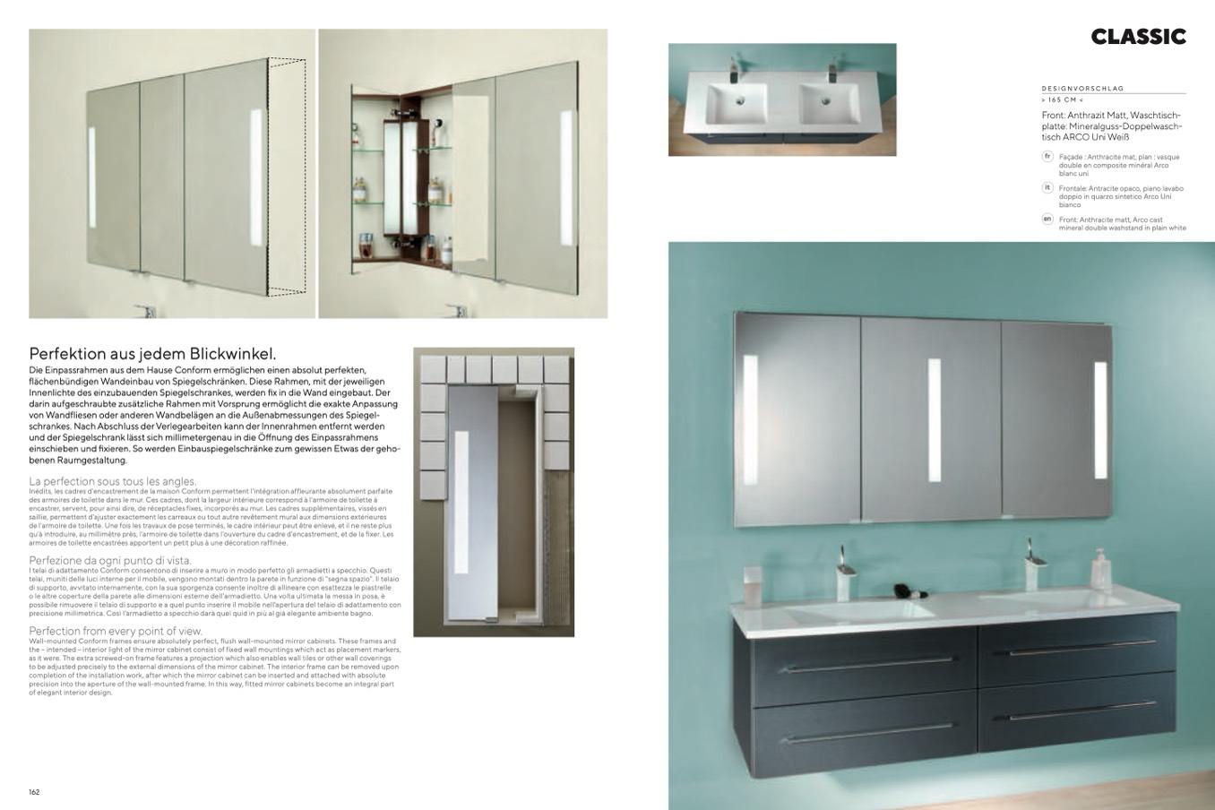 Wall-mounted Conform frames ensure absolutely perfect, flush wall-mounted mirror cabinets. These frames and