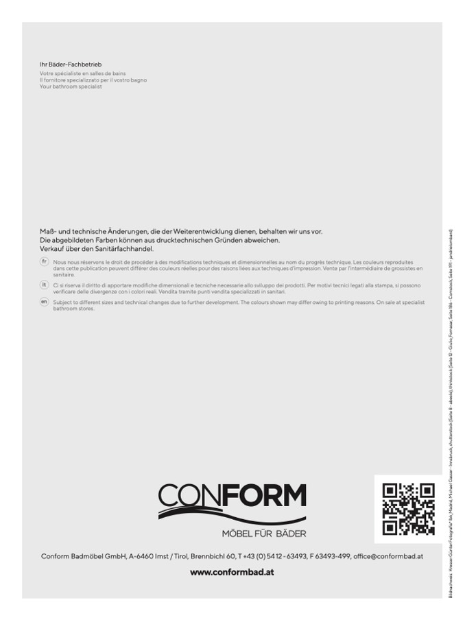 Conform Badmöbel GmbH, A-6460 Imst / Tirol, Brennbichl 60, T +43 (0) 54 12 - 63493, F 63493-499, office@conformbad.at