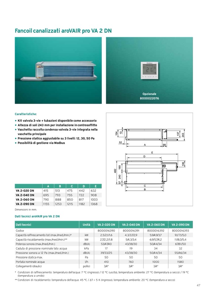 * Condizioni di raffrescamento: temperatura dell'acqua: 7 °C (ingresso) / 12 °C (uscita), temperatura ambiente: 27 °C (temperatura a secco) / 19 °C