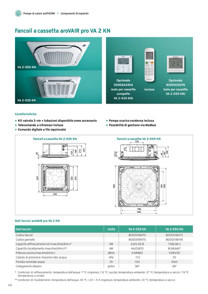 * Condizioni di raffrescamento: temperatura dell'acqua: 7 °C (ingresso) / 12 °C (uscita), temperatura ambiente: 27 °C (temperatura a secco) / 19 °C