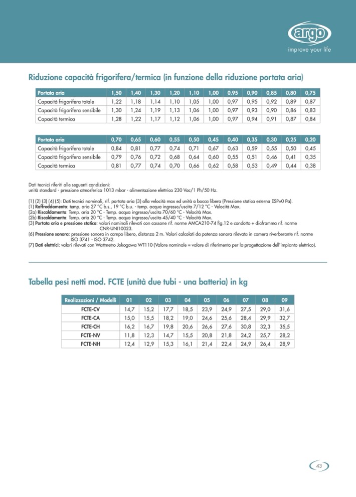 (1) Raffreddamento: temp. aria 27 °C b.s., 19 °C b.u. - temp. acqua ingresso/uscita 7/12 °C - Velocità Max.