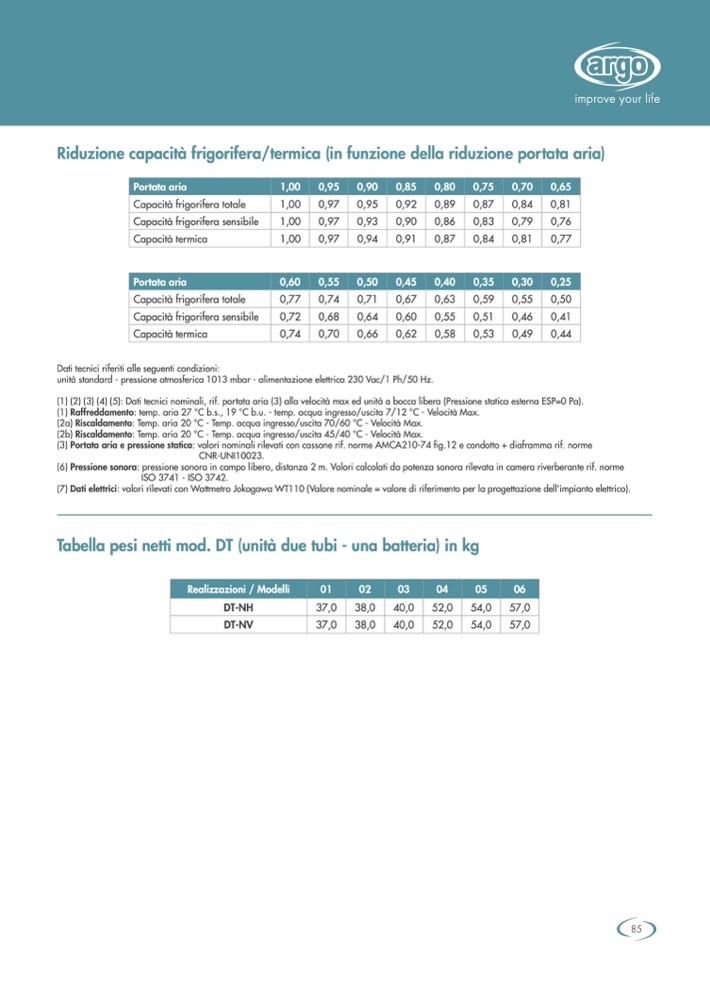 (1) Raffreddamento: temp. aria 27 °C b.s., 19 °C b.u. - temp. acqua ingresso/uscita 7/12 °C - Velocità Max.