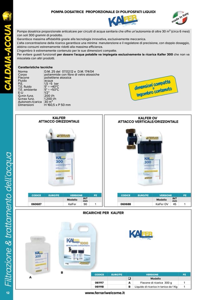 Per evitare guasti funzionali per dosare l’acqua potabile va impiegata esclusivamente la ricarica Kalfer 300 che non va