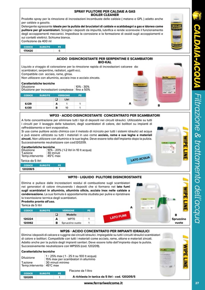 Elimina i depositi di calcare e ruggine dai circuiti idraulici. Impiegabile su tutti i circuiti idraulici scambiatori