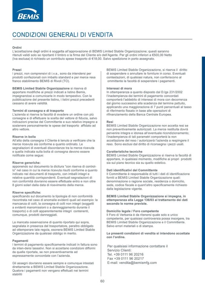 L’accettazione degli ordini è soggetta all’approvazione di BEMIS Limited Stabile Organizzazione; questi saranno