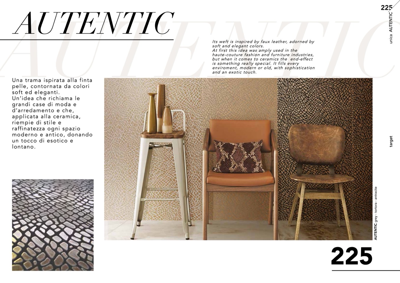 Its weft is inspired by faux leather, adorned by
