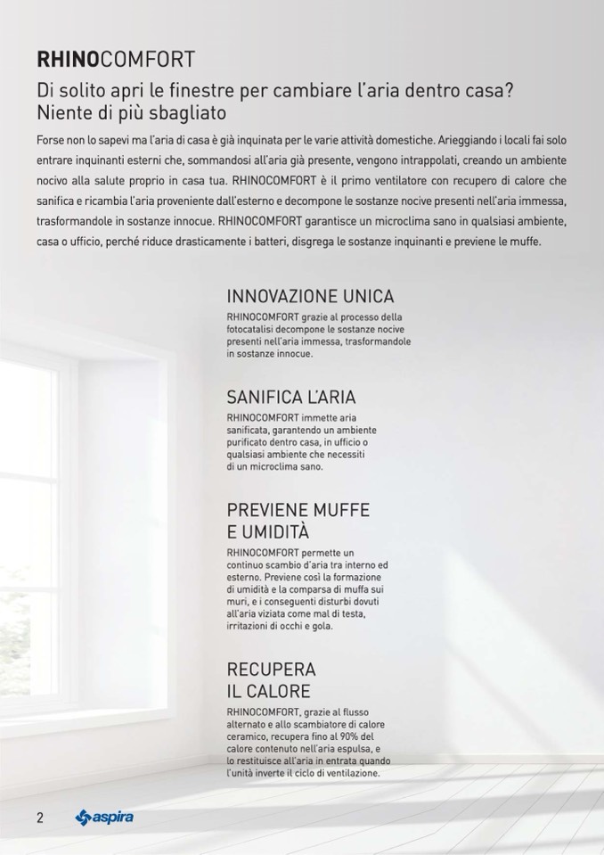nocivo alla salute proprio in casa tua. RHINOCOMFORT è il primo ventilatore con recupero di calore che