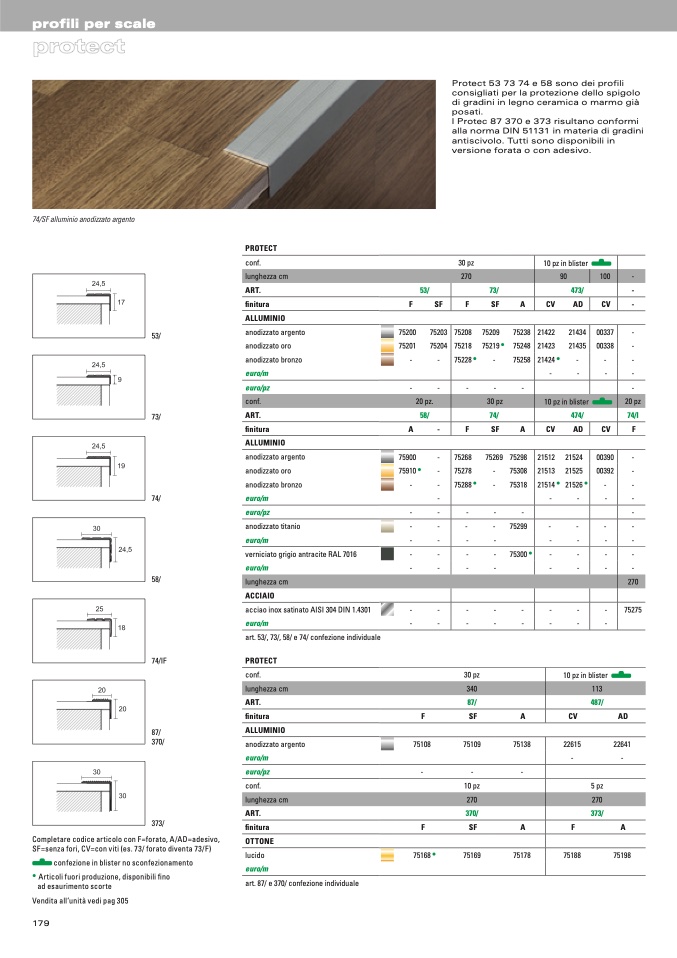 SF=senza fori, CV=con viti (es. 73/ forato diventa 73/F)