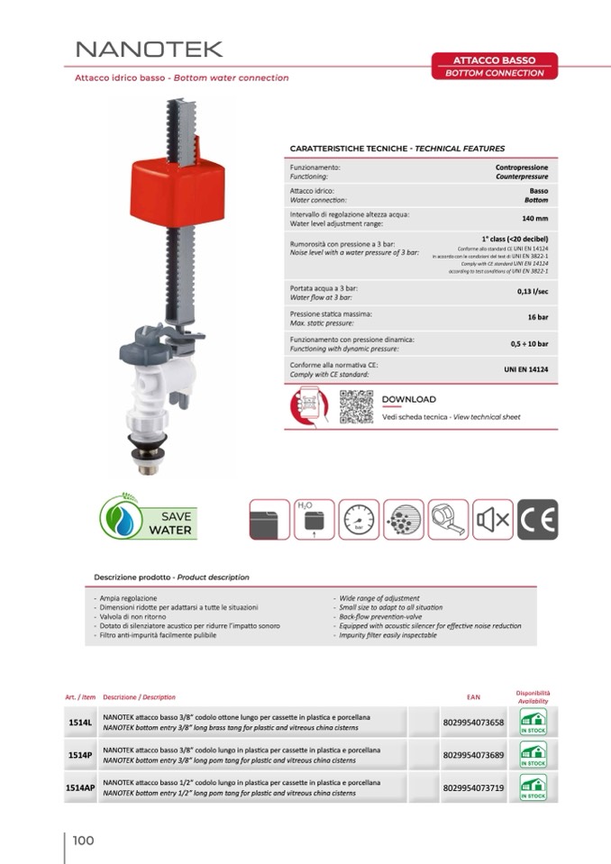 NANOTEK bottom entry 3/8” long brass tang for plastic and vitreous china cisterns