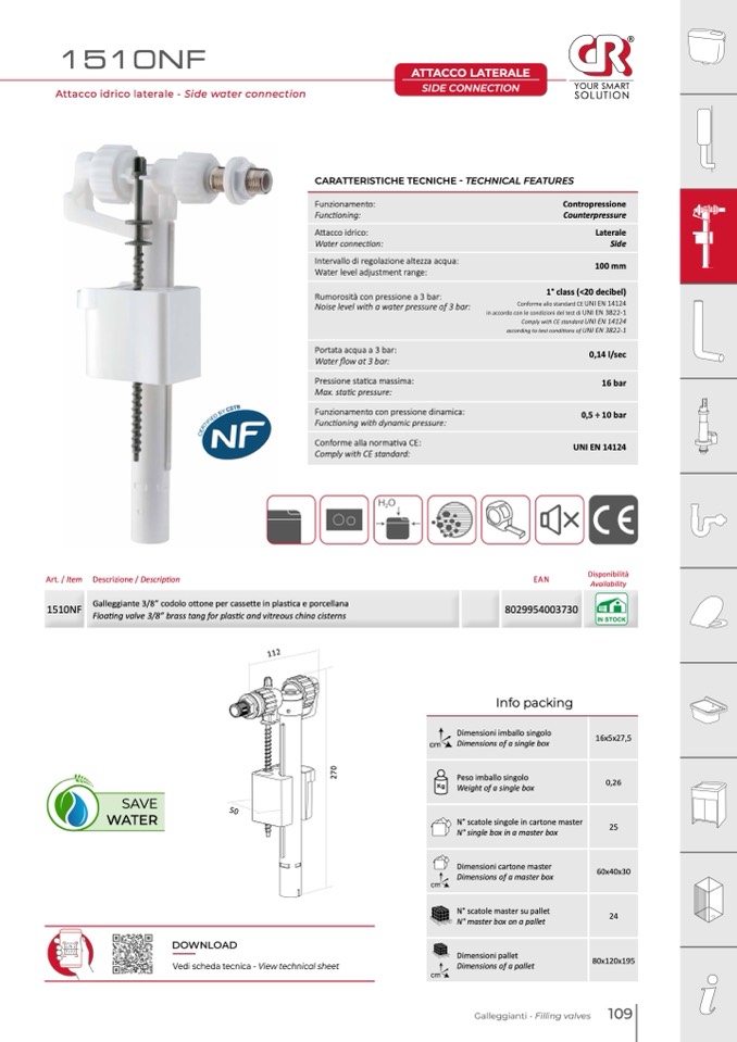 Floating valve 3/8” brass tang for plastic and vitreous china cisterns