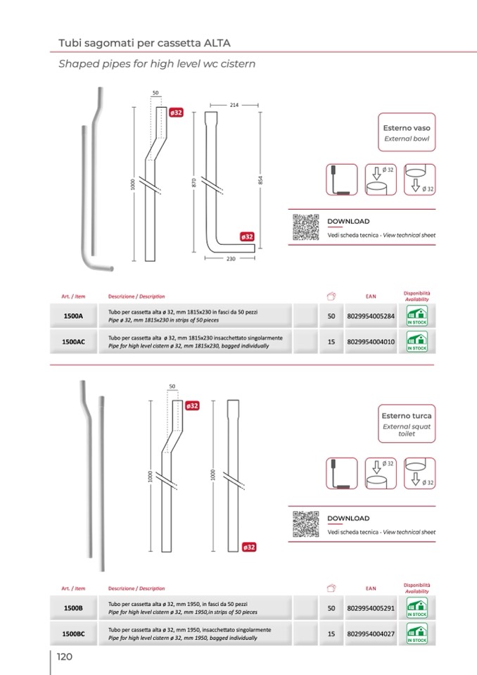 Pipe for high level cistern ø 32, mm 1950,in strips of 50 pieces