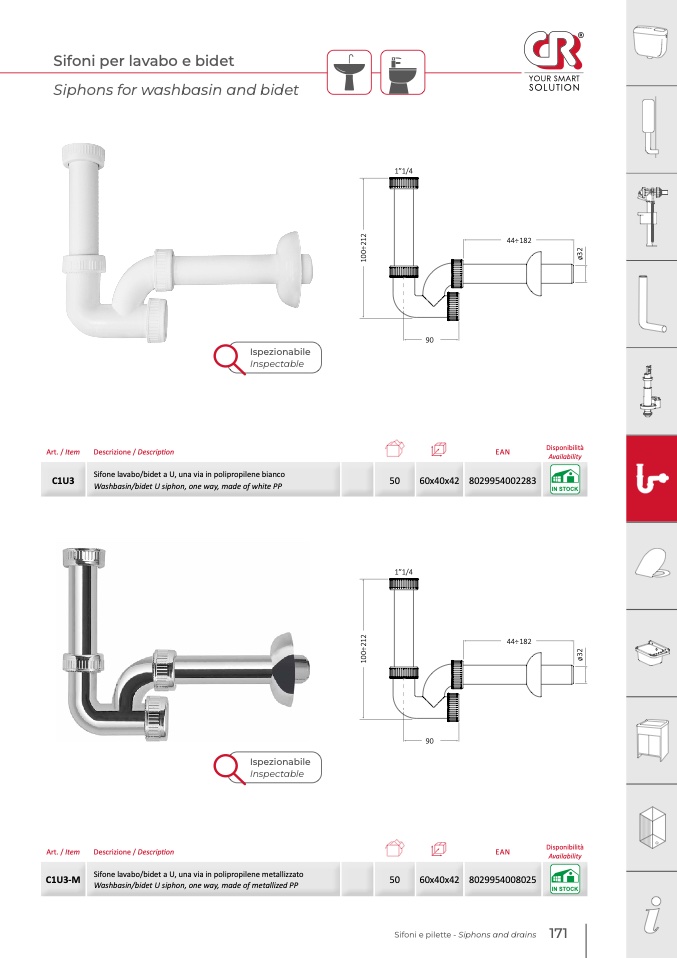 Sifone lavabo/bidet a U, una via in polipropilene metallizzato