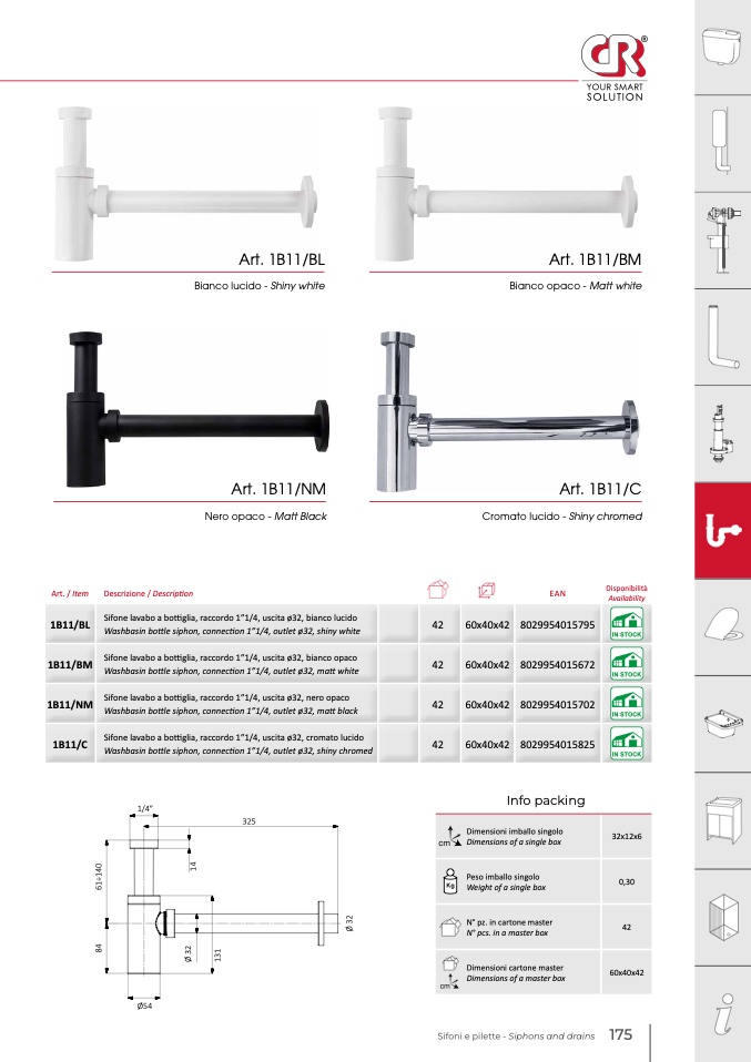 Sifone lavabo a bottiglia, raccordo 1”1/4, uscita ø32, bianco lucido