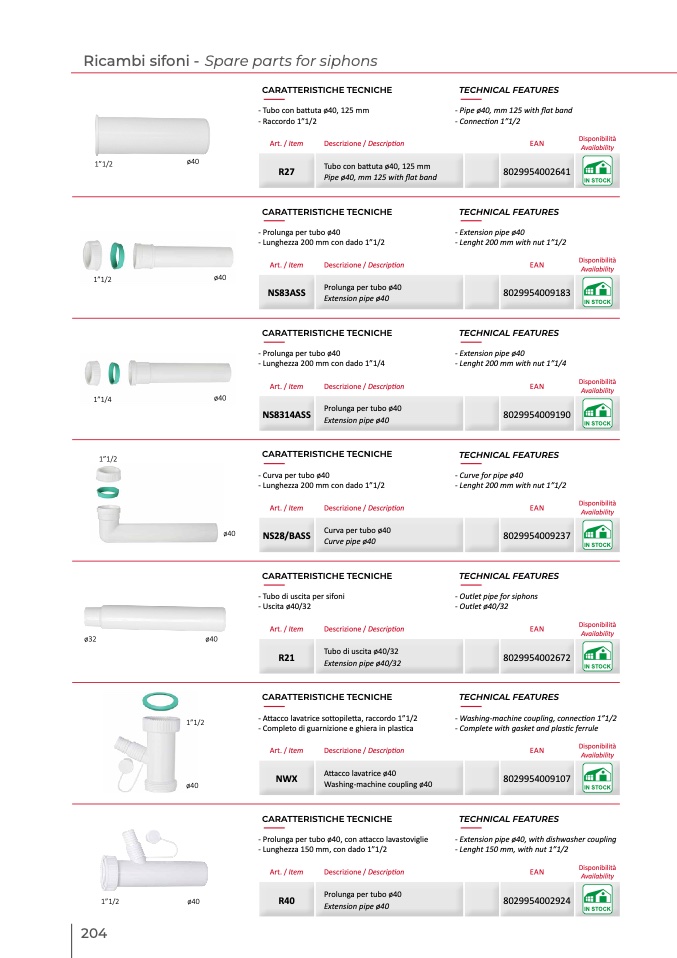 - Prolunga per tubo ø40, con attacco lavastoviglie
