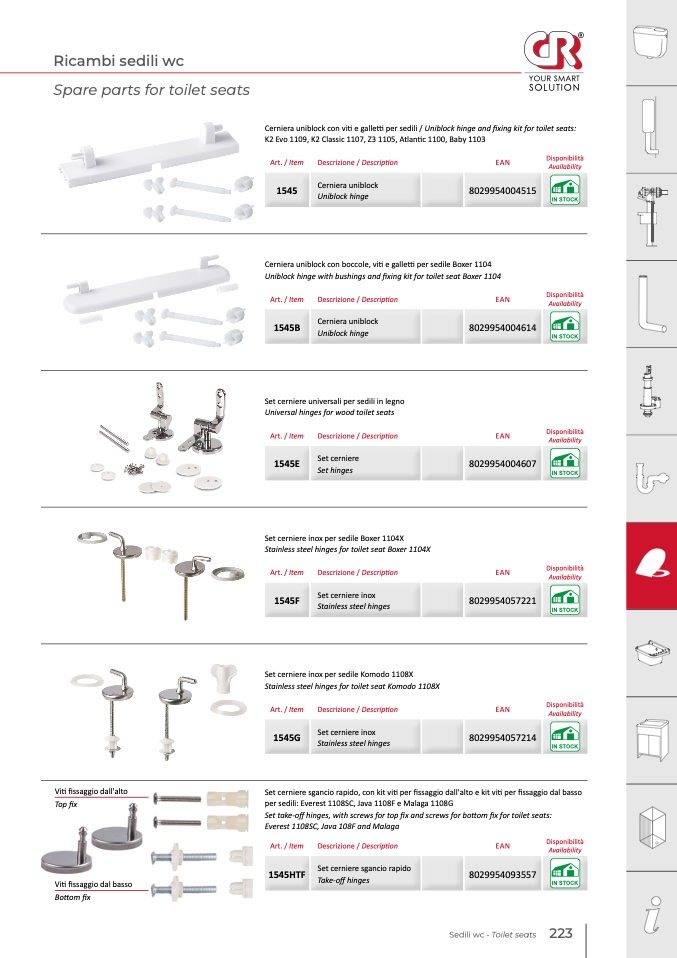 Cerniera uniblock con viti e galletti per sedili / Uniblock hinge and fixing kit for toilet seats:
