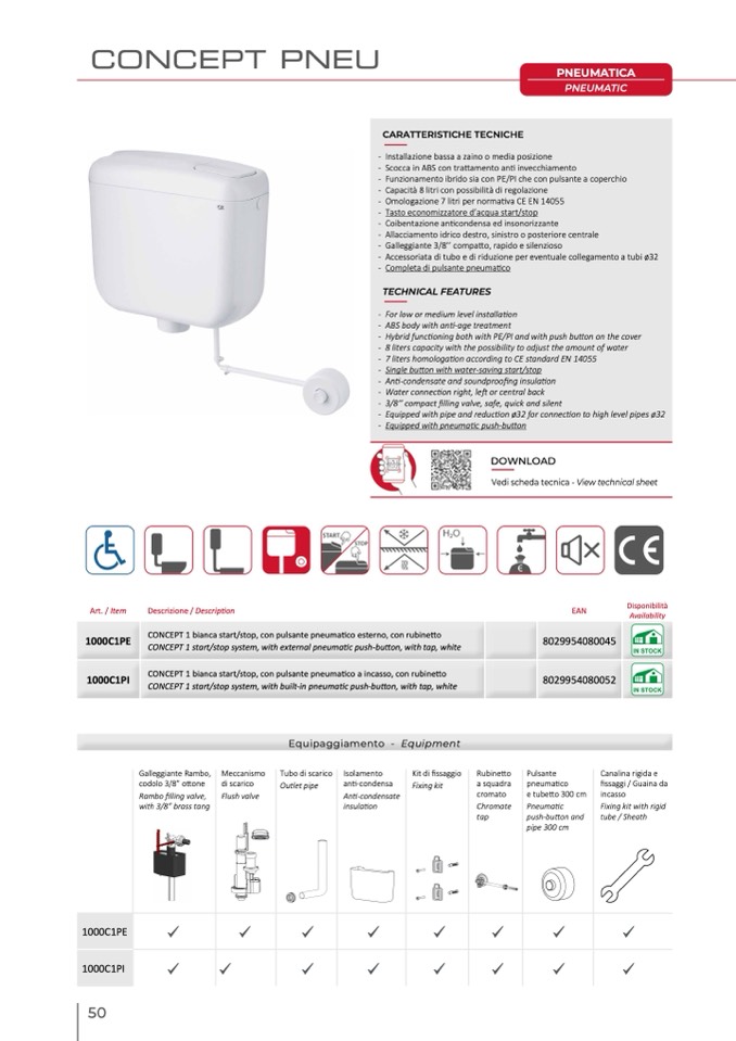 CONCEPT 1 bianca start/stop, con pulsante pneumatico a incasso, con rubinetto