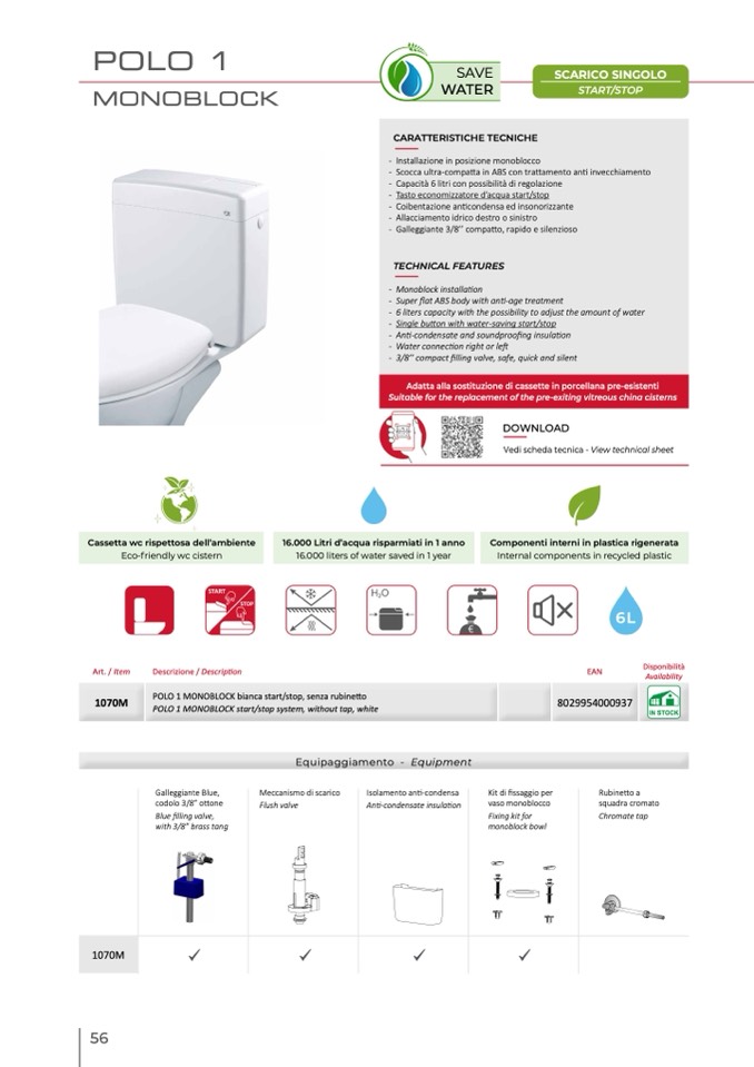 POLO 1 MONOBLOCK bianca start/stop, senza rubinetto