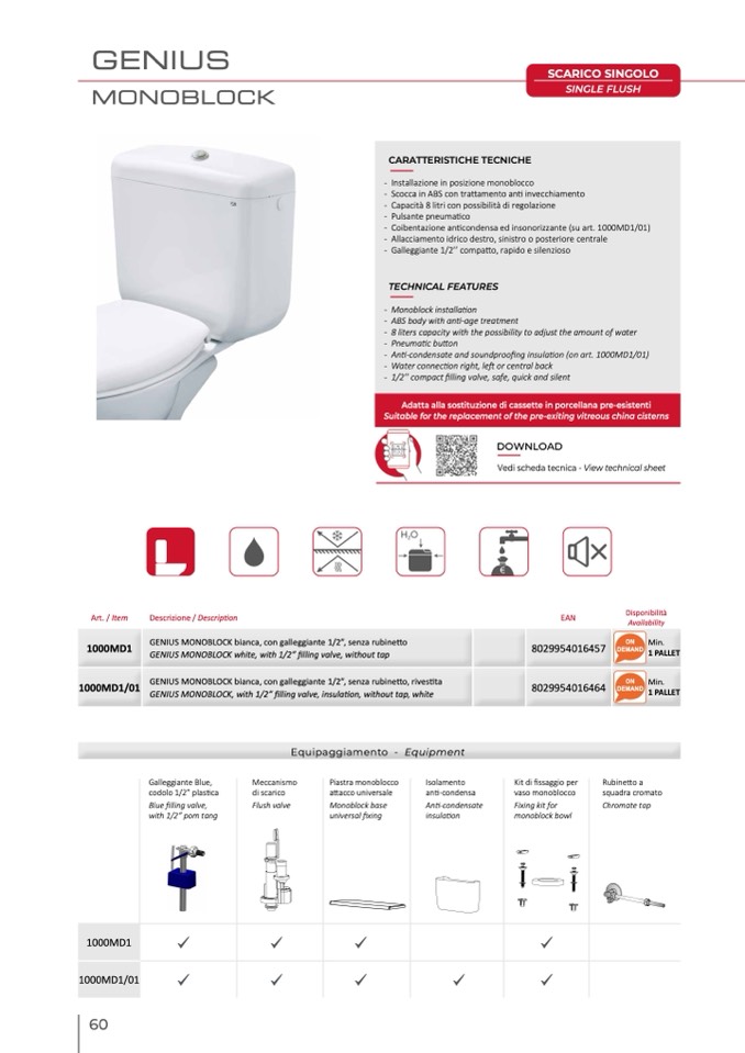 GENIUS MONOBLOCK bianca, con galleggiante 1/2”, senza rubinetto, rivestita