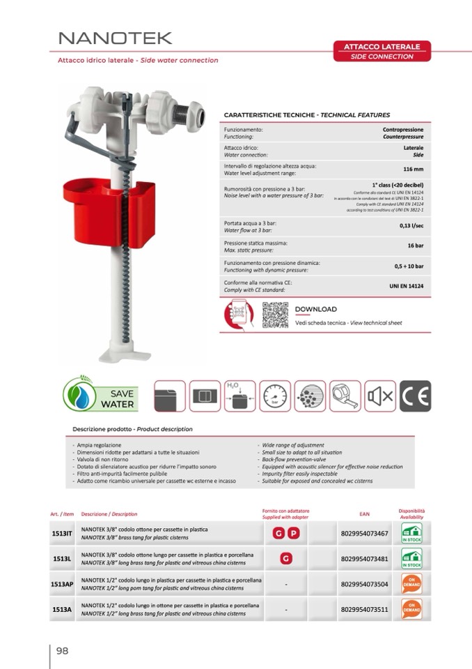 NANOTEK 1/2” long brass tang for plastic and vitreous china cisterns