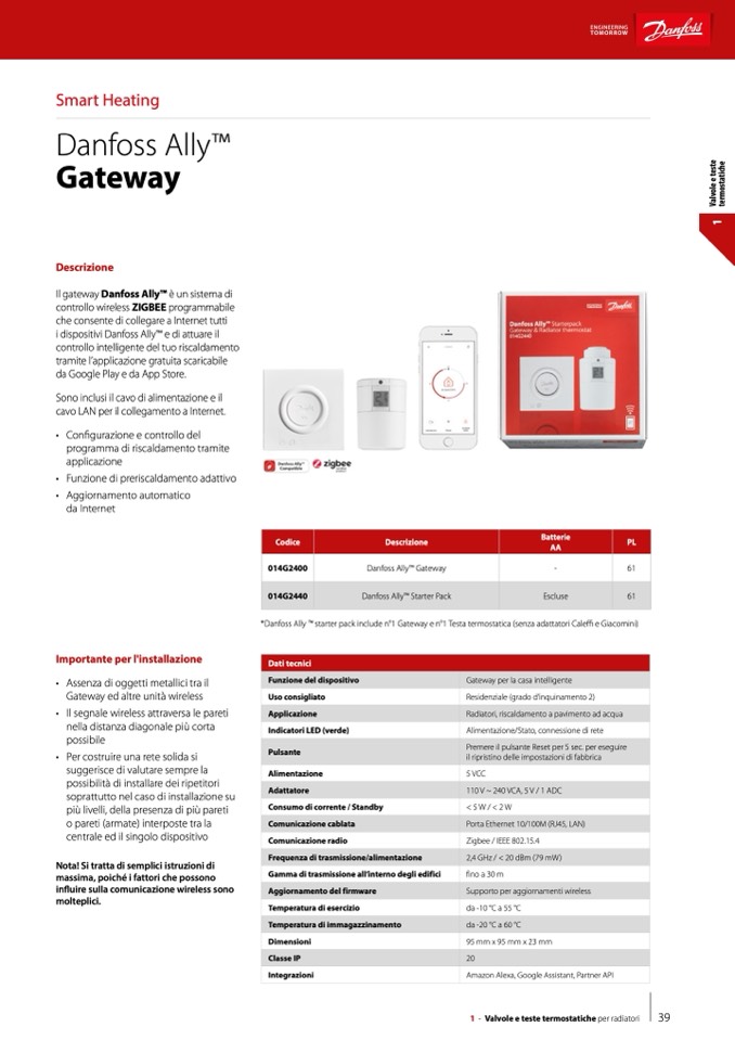 *Danfoss Ally TM starter pack include n°1 Gateway e n°1 Testa termostatica (senza adattatori Cale