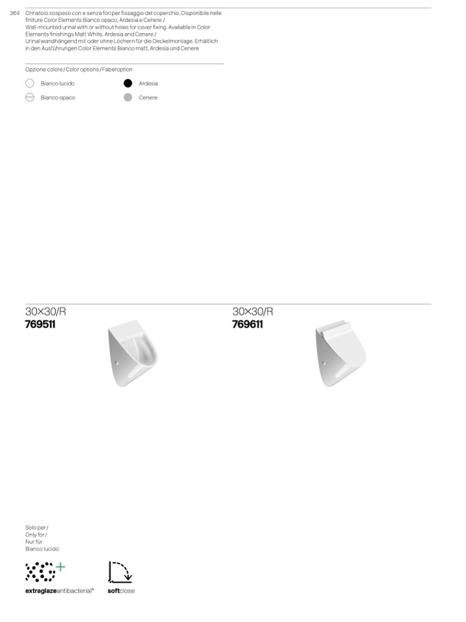 364 Orinatoio sospeso con e senza fori per fissaggio del coperchio. Disponibile nelle