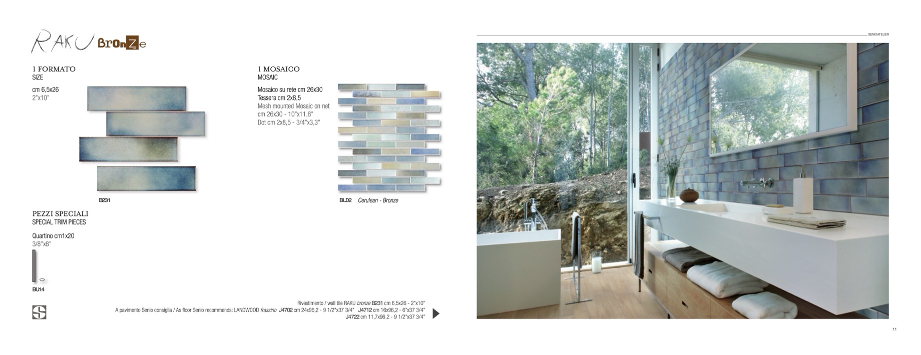 A pavimento Senio consiglia / As floor Senio recommends: LANDWOOD frassino J4702 cm 24x96,2 - 9 1/2”x37 3/4” J4712 cm 16x96,2 - 6”x37 3/4”