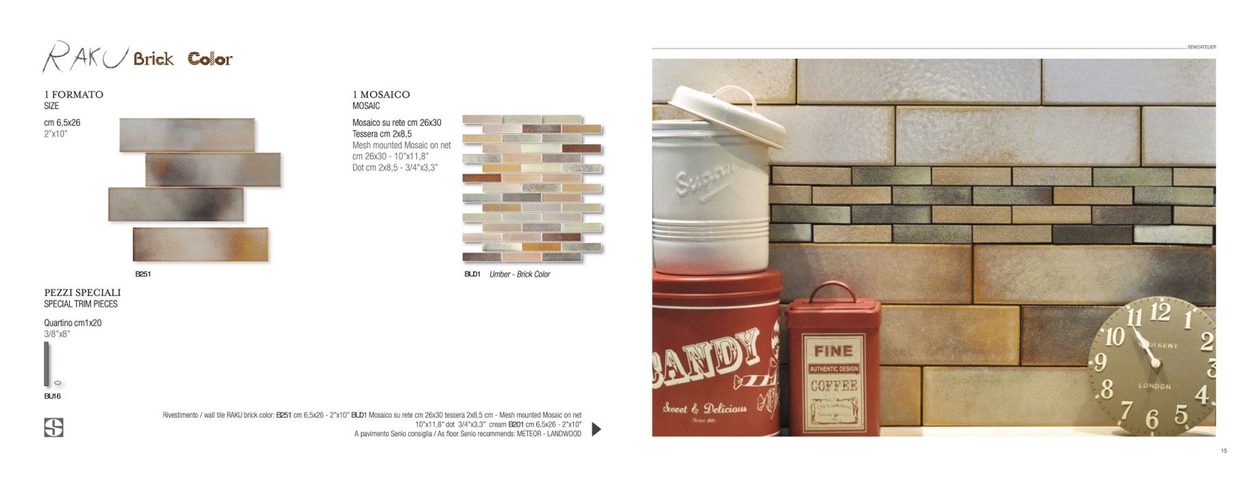 Rivestimento / wall tile RAKU brick color: B251 cm 6,5x26 - 2”x10” BU01 Mosaico su rete cm 26x30 tessera 2x8,5 cm - Mesh mounted Mosaic on net