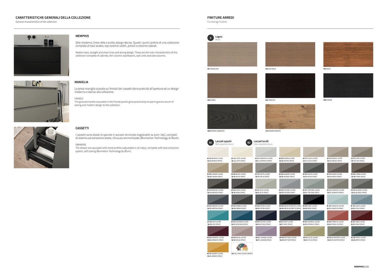 completa di basi lavabo, top ceramici sottili, pensili e colonne laterali.