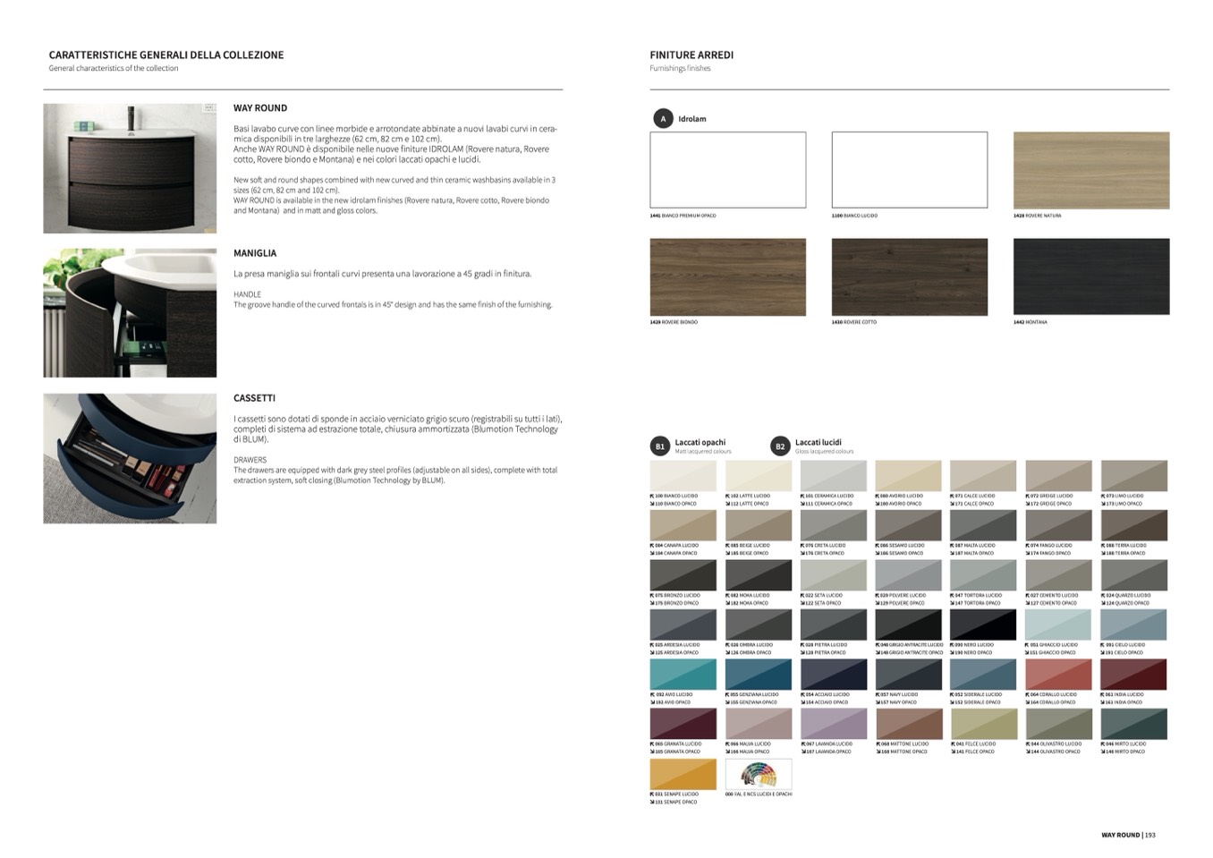 cotto, Rovere biondo e Montana) e nei colori laccati opachi e lucidi.