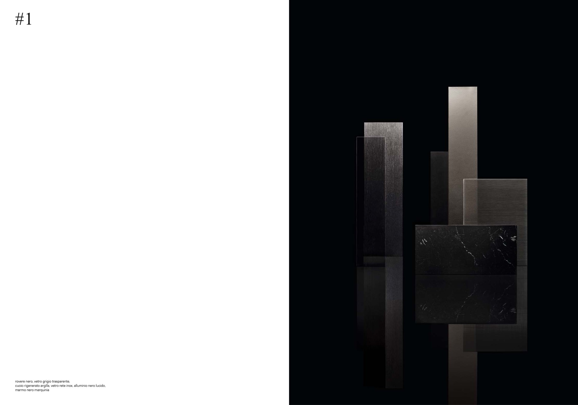 cuoio rigenerato argilla, vetro rete inox, alluminio nero lucido,