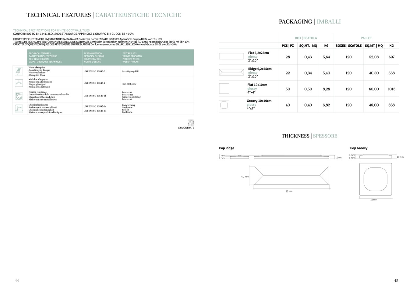 CARATTERISTICHE TECNICHE RIVESTIMENTI IN PASTA BIANCA Conformi a Norme EN 14411 ISO 13006 Appendice l Gruppo BIII GL con Eb > 10%