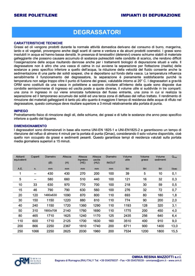 I degrassatori sono dimensionati in base alla norma UNI-EN 1825-1 e UNI-EN1825-2 e garantiscono un tempo di