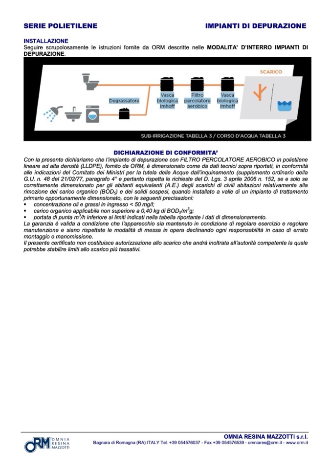 Con la presente dichiariamo che l’impianto di depurazione con FILTRO PERCOLATORE AEROBICO in polietilene