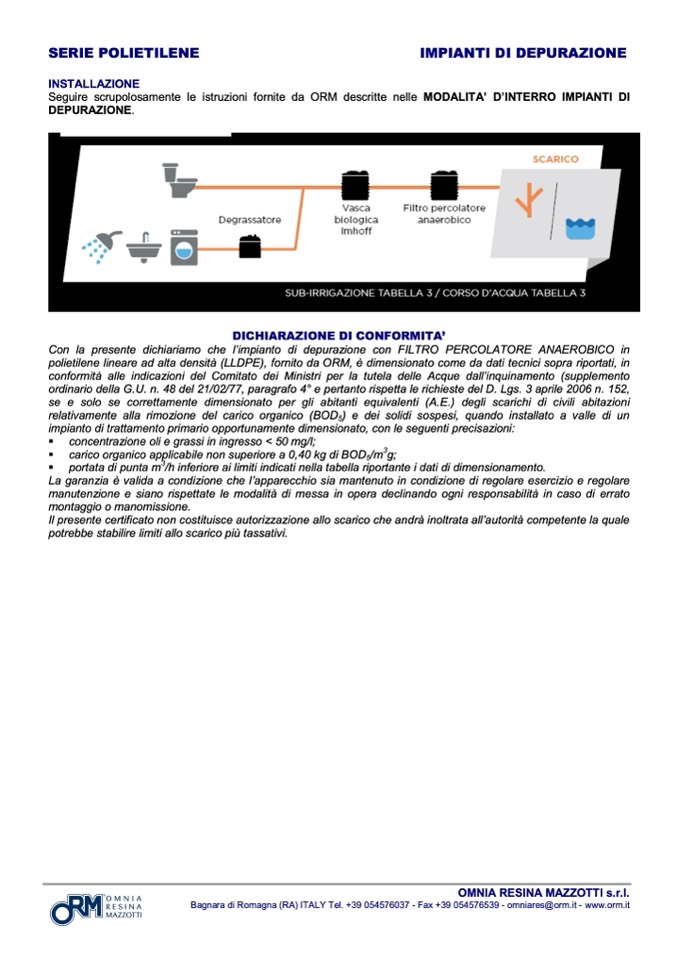 Con la presente dichiariamo che l’impianto di depurazione con FILTRO PERCOLATORE ANAEROBICO in