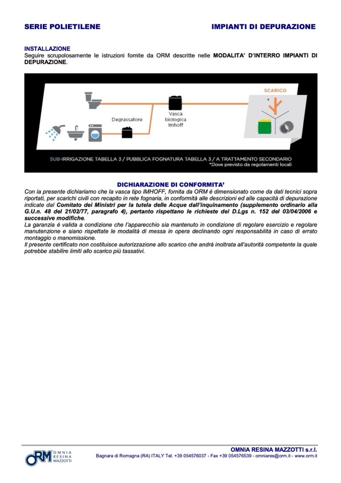 Con la presente dichiariamo che la vasca tipo IMHOFF, fornita da ORM è dimensionato come da dati tecnici sopra