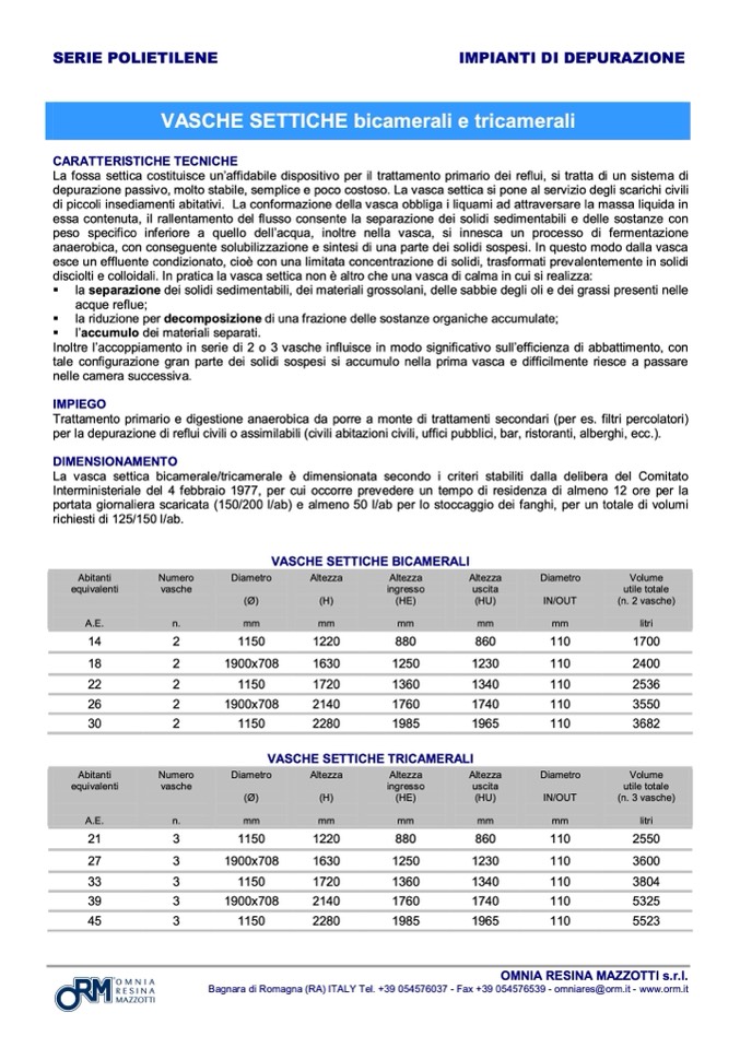 La vasca settica bicamerale/tricamerale è dimensionata secondo i criteri stabiliti dalla delibera del Comitato