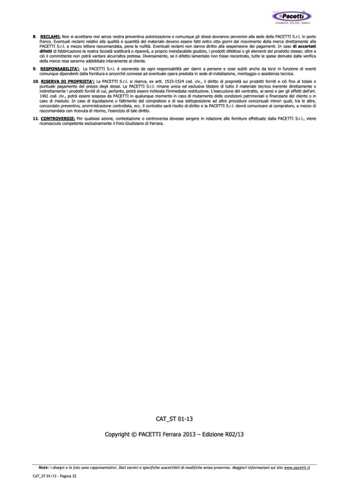 RECLAMI: Non si accettano resi senza nostra preventiva autorizzazione e comunque gli stessi dovranno pervenire alla sede della PACETTI S.r.l. in porto