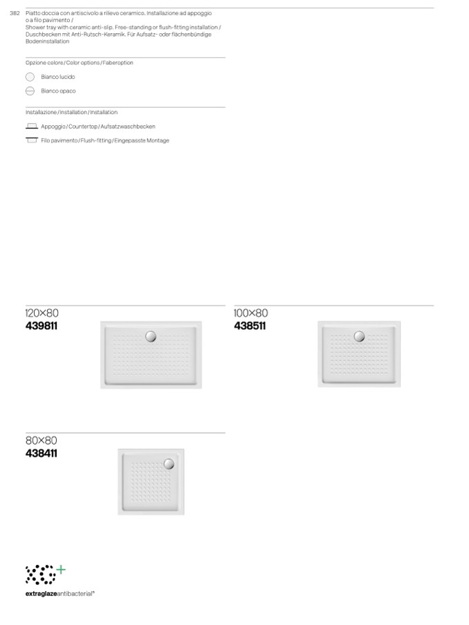 382 Piatto doccia con antiscivolo a rilievo ceramico. Installazione ad appoggio