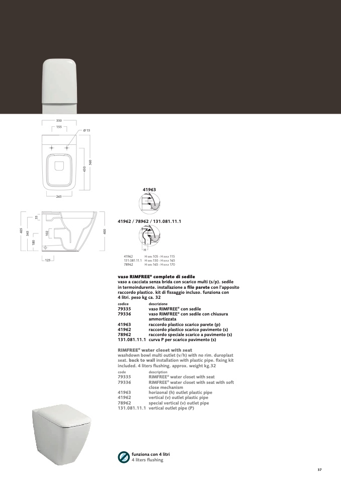 vaso a cacciata senza brida con scarico multi (s/p). sedile