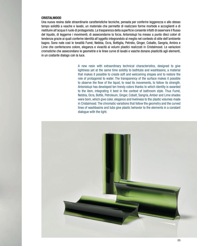 del liquido, di leggerne i movimenti, di assecondarne la forza. Antoniolupi ha messo a punto dieci colori di