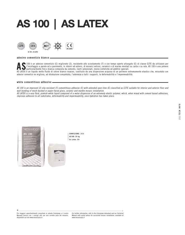 l’incollaggio a parete ed a pavimento, in interni ed esterni, di mosaici vetrosi, ceramici e di marmo montati su carta o su rete. AS 100 è una polvere