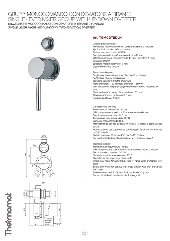 Ø of the holes in the panel: single lever mixer 49 mm. – diverter 29