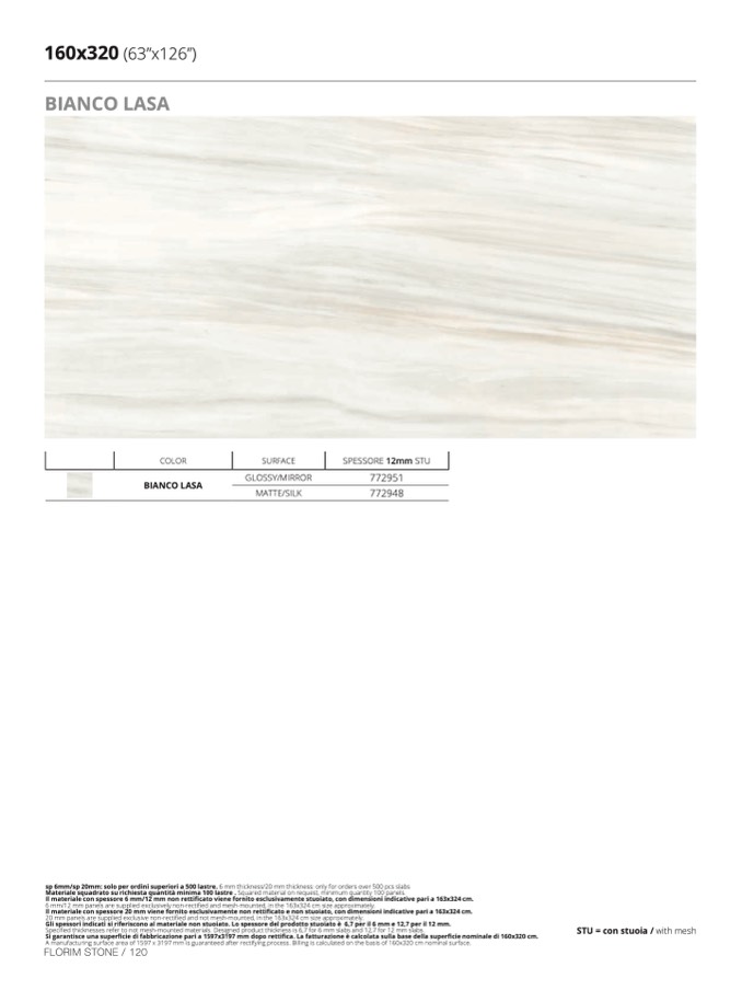 sp 6mm/sp 20mm: solo per ordini superiori a 500 lastre. 6 mm thickness/20 mm thickness: only for orders over 500 pcs slab