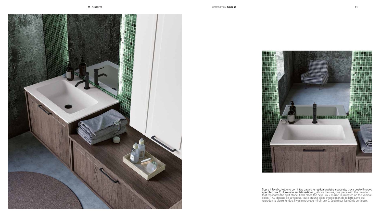 Sopra il lavabo, tutt’uno con il top Lava che replica la pietra spaccata, trova posto il nuovo